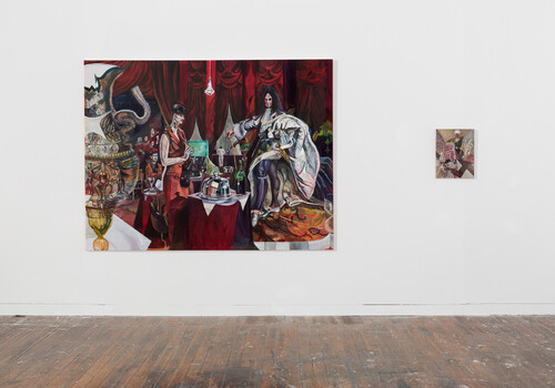 This exploration of the ordinary (and its political dimensions) manifested in Christopher Theofanous’ paintings. In A Bitter Decadent Morsel (2020), the central figure, perhaps an homage to King Louis XIV, is a mere prop in a far more dynamic scene. His historic status as a revered figure, above the everyman, is quashed. There seems to be a definitive stab at the upper class mirrored within his work Mock Life (2020). The pieces force us to consider the ways in which our own artistic privilege meets with the flow of society. In this post-Trump age of lucrative faux class, we see that once reflected the upper echelon of the world lose their intrigue. The works delve into a deeper critique of society through an evocative nod to Juan Davila and his commentary on the politicisation of class, sexuality and the individual. There is a strong feeling of cutting back the facades we present, to highlight the deeper notions of what it is to be part of a society that amplifies the falsehoods of class and refined taste. This is done through hidden figures and fragmented masks that enable the viewer to see past the presentation and into the reality of the person underneath.