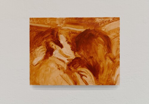 Emerging from the Other Lights and Sounds (2020) ousts the voyeur in us all, making us unequivocally aware of our own nosy tendencies. We join the central figures as they peer into the window of their neighbours, finding entertainment and intrigue through their nosiness. As with Theofanous’ paintings, a warm and muddy colour palate is utilised, creating that feeling of well-worn experiences, and the comfort that brings. Again, we are reminded of the subtle excitement in the ordinary moment. Warm tones and a softness of treatment create a comfortable space upon which to reflect on the intrusion of our own eyes.