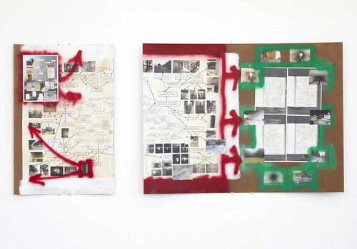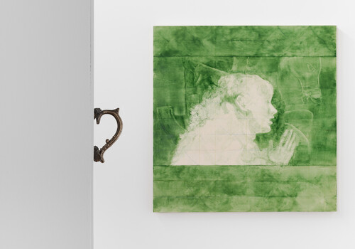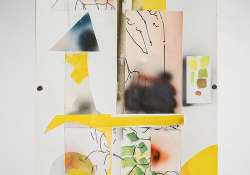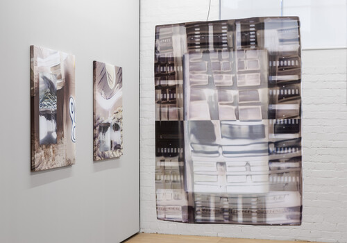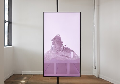 This kaleidoscopic shift is further exemplified within the work of Pang Jie Siah, located in the adjoining room. The shifting light and cubic spaces created brings the mundane into a realm of interest. In Public Bathroom Mirrors (2020), a shock of grids and reflections weaves a world of intrigue into an area of obscurity. A subtle moment in time is created when one is lost in the convergence of mirrors. Dim lights cast a muddy hue across the mustard tiles, and the sink juts out bringing the viewer into the scene—meeting the faceless stranger in a world so foreign to the isolation of our homes, presenting to us the anonymity of public spaces.