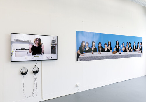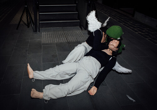 In the performance On becoming one’s own angel (2023), both Fitz-Gerald and her sculpted double wear feathered white angel wings, solving the mystery of the stray white feather. I feel I can almost see the figure’s chest raise in a shallow breath. My eyes trace the lines of her palms and outline the raised veins that run along her feet. Given the artist’s evident technical proficiency, the rough construction of the wings from feathers, glue and cardboard seems a deliberate choice, allowing fragments to drift through the space as remnants of the bittersweet performance. Whether intentional or not, the feather’s presence on the bear prompts us to connect these two pieces through their angelic underpinning: the angels of the Solomon painting support Eve’s body, just as Fitz-Gerald supports herself.