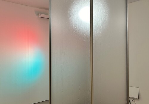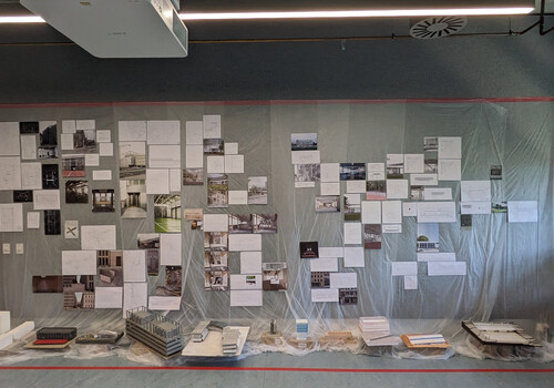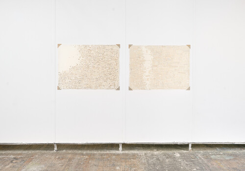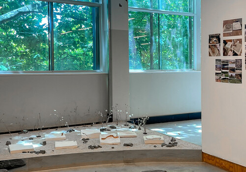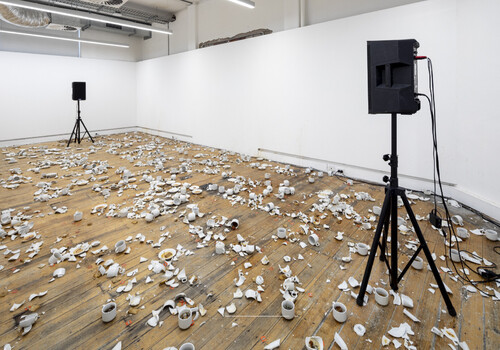 When it comes to blurring the lines between the everyday and art, Amelia Rose’s installation serves as a case in point. Site-specificity all the way through: debris from scratched wall painting revealing sandstone, a curled-up floor linoleum corner, copper-coiled pipes, metal rods––all easily mistaken for building interiors. Rose’s sculptural work demands a close, physical engagement, as it seamlessly blends with and responds to the space. It draws attention to its intrinsic details and transformation over time. The work offers a new way of seeing the building, exposing its readily available information and making it come alive, as if it would want to speak to us and share its layered secrets, its lived history and what it’s made of.