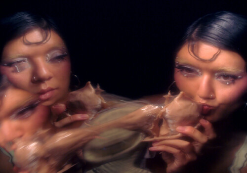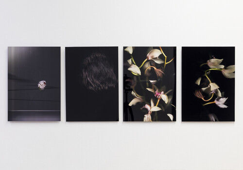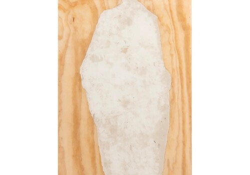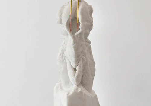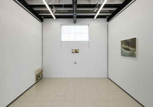Ruby McVicar’s Perfect (2024) also embraces an unglamorous mundanity. Two clear, medium-sized plastic bags hang pinned side by side to the wall. Below, a bag of oranges sits on a metal rack alongside a pair of plastic, worn-down heels. The elements and their arrangement suggest a bodily, female presence. Upon closer examination, the thin skins of the bags subtly vibrate, responding to the faintest breeze from one’s proximity. Quite delicately, the plastic’s transparency against the white backdrop gives it a somewhat ethereal aura, while the work’s hardly coincidental dimensions of 100 x 100 x 100 cm further contribute to the exploration of traditional notions of perfection. McVicar negotiates fragility, ephemerality and the synthetic, offering a renewed construction of femininity that opposes classical Western representations of the female form in sculpture.