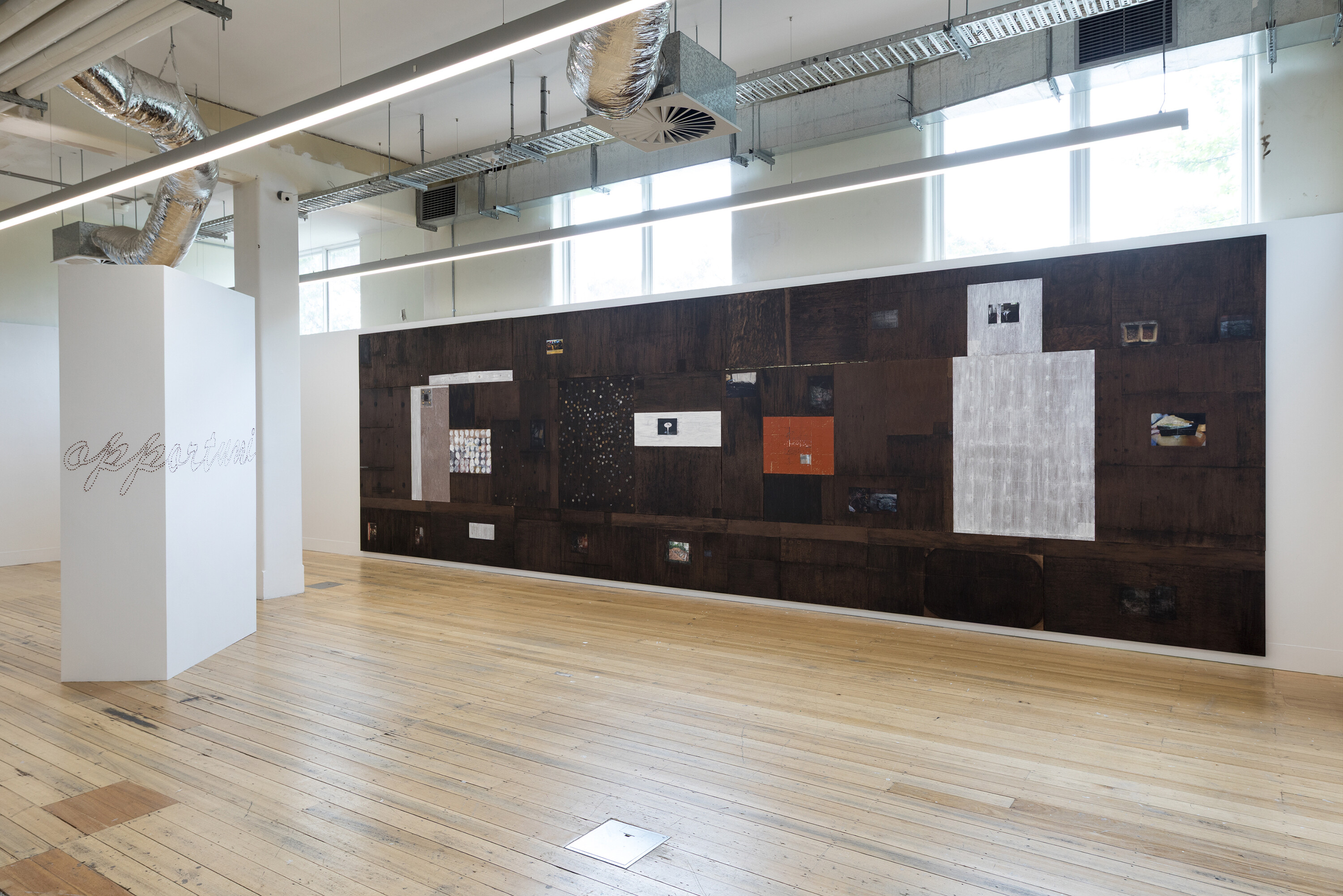 Aliza Nickle, Wonderfilled, 2025, masonite, paper, oil stick, stainless steel, leather, one-dollar bills, brass, 250 x 850 cm, Monash University Caulfield. Photo: Andrew Curtis.