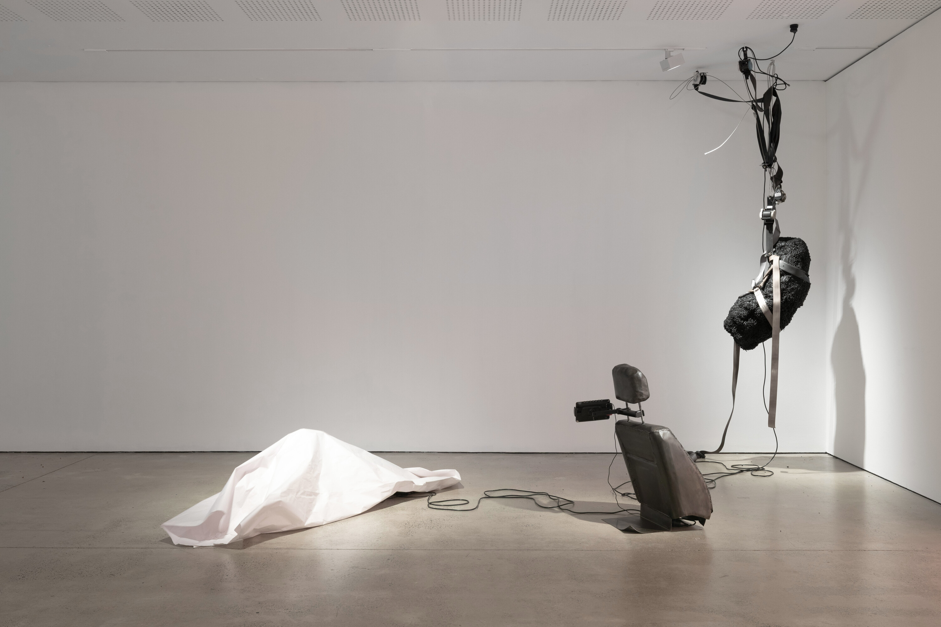 Seren Wagstaff, Passenger Princess, 2025, installation, video, steel, bitumen, paper, seat belts, electric motor, The Annual, UNSW Galleries. Photo: Jessica Maurer.