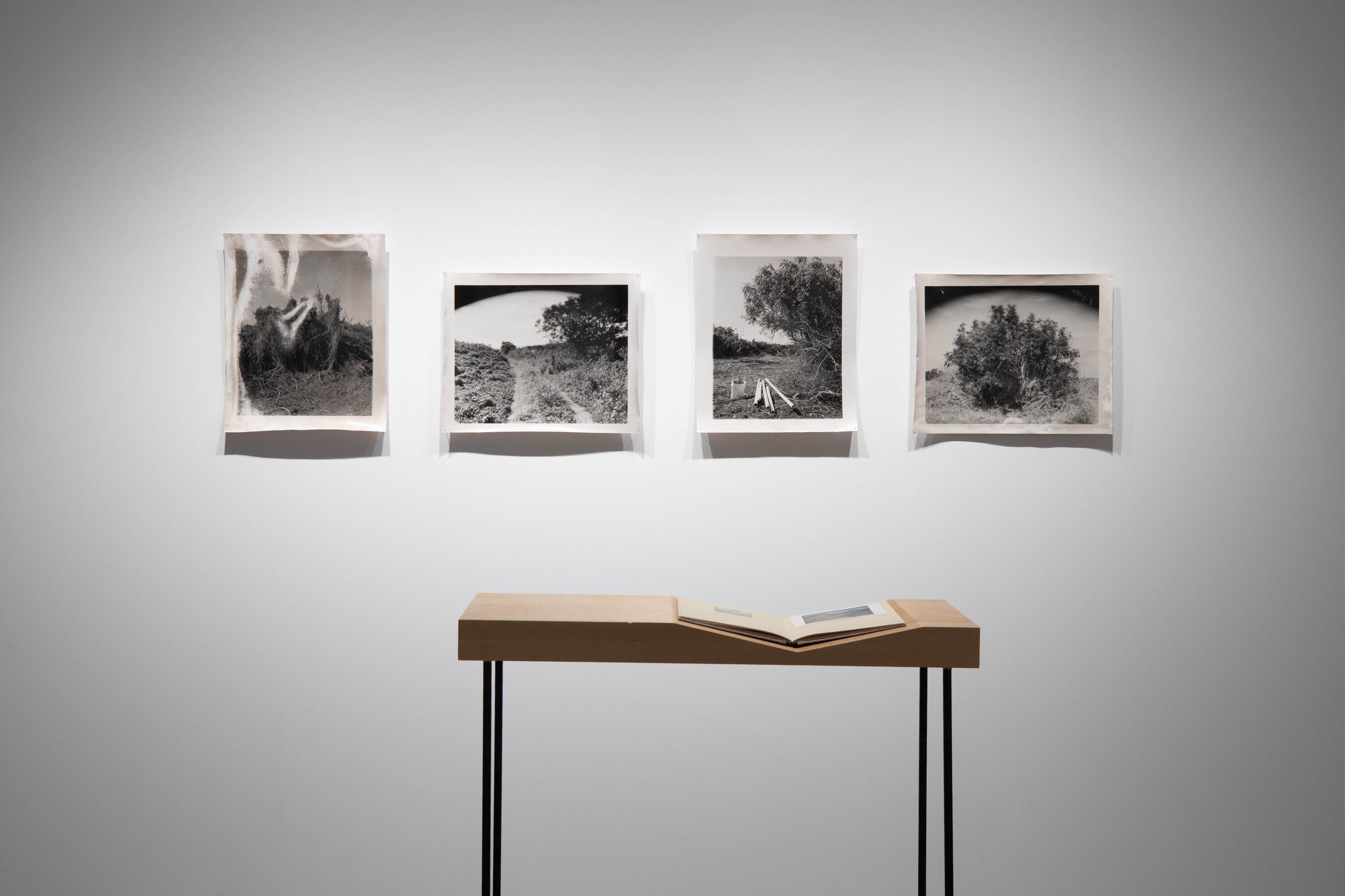 Zac Tomaszewski, CONSTRUCTED LAND, 2025, installation, archival inkjet print, expired silver gelatine fibre prints, soil, hand-bound artist book, contact print, The Annual, UNSW Galleries. Photo: Jessica Maurer.