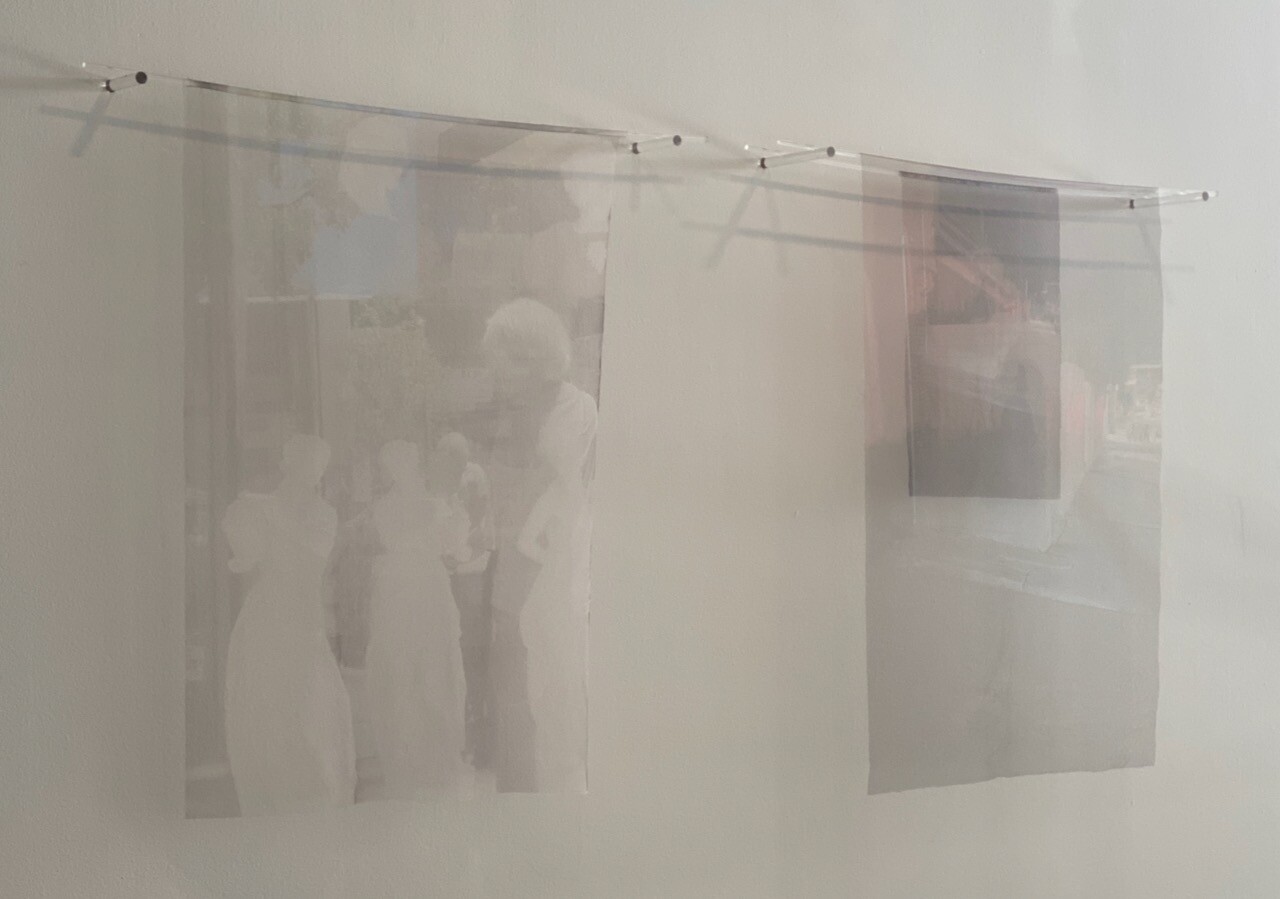 Upstairs, an installation of photographs printed on tulle banners is an apparition in my periphery. Three banners are hung from clear resin rods protruding from the wall. Two of them are layered behind each other like fabric on a clothesline. I approach Jennifer Fernandez’s Untitled (2025) as if it were a baby animal, cautious and anxious that it may elude me. Two additional photographic prints in the corner clue me in. Fernandez has taken the photos on her phone in the reflections of windows in front of construction sites, apartment buildings, and the street. She is alone. Her aging face and body against the ever-changing urban space is a poignant reminder of time. The two timelines are at odds with each other: one, a staunch and graceful acceptance; the other, in denial and clawing at renewal. I stay a while in hope that Fernandez will reveal herself to me, but she is choosing to be seen on her own terms.