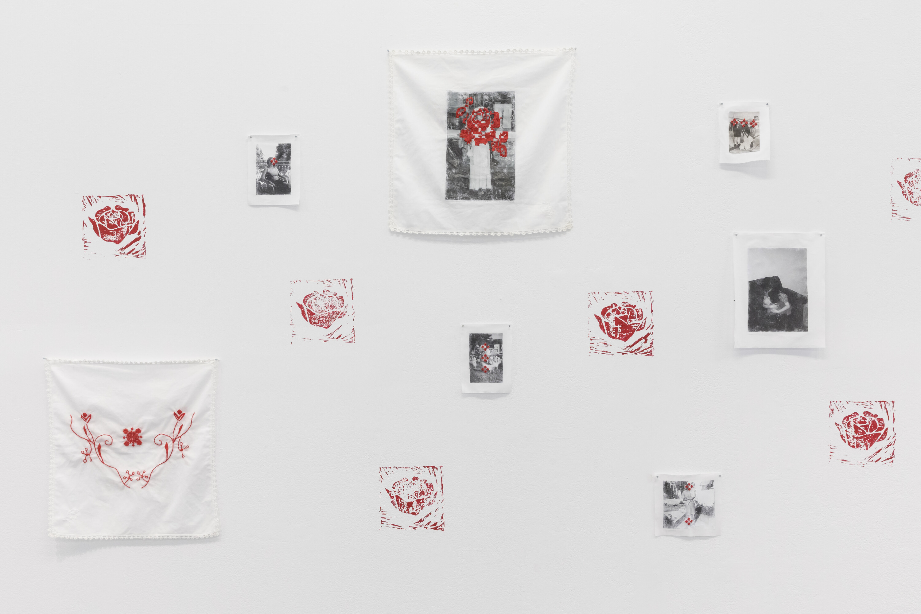 Zara Buljat, U Crvenom Vez (In Red Embroidery), 2025, mixed-media installation, embroidery on fabric, archival photograph transfer, stamped prints, dimensions variable, Monash University, Caulfield. Photo: Andrew Curtis.