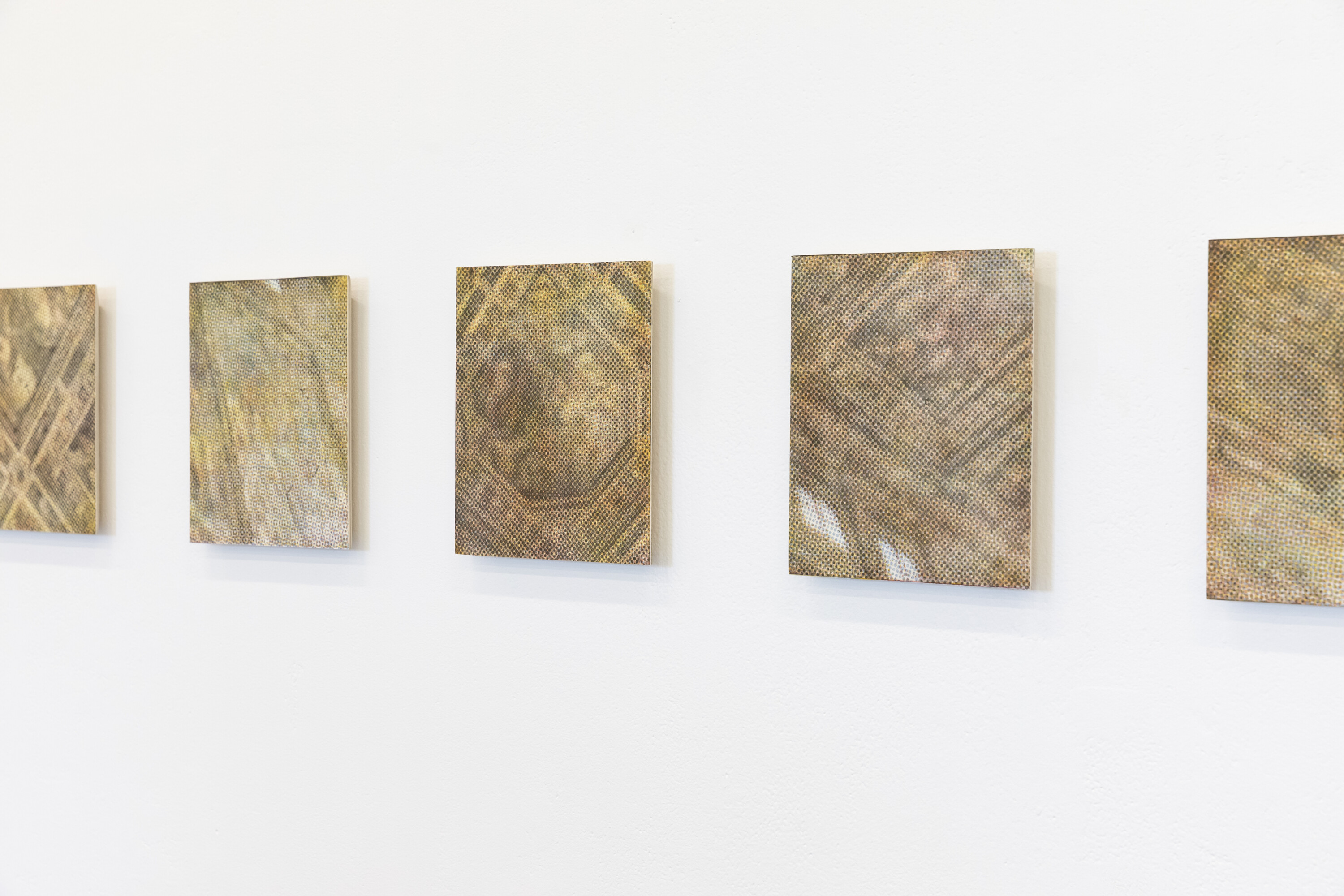 The obscured scene conjures a foggy familiarity. I might have once gazed up at this ceiling, or looked down and seen the geometric grids of moulded plaster as city streets on Google Maps. But, getting closer, it registers that this familiarity is not with the images, but how Picciani has reproduced them. They’re printed in a blown-up version of the layered CMYK dots that compose nearly every digitally-printed image we see, recreated, impressively, via copper etching. With this laborious and tactile medium, Picciani has restored visible dimensionality to the microscopic patterns that invisibly compose computer prints, centring herself and her handiwork as the imaging apparatus. Intensifying the physical structure of everyday printed images, she makes us feel every action of the regular work of looking necessary to materialise a subject in these masses of coloured dots. The materiality of her mark-making is solidified by the prints’ sturdy wooden supports, which lend them a sculptural quality; but something softer in the next room has drawn my eye.