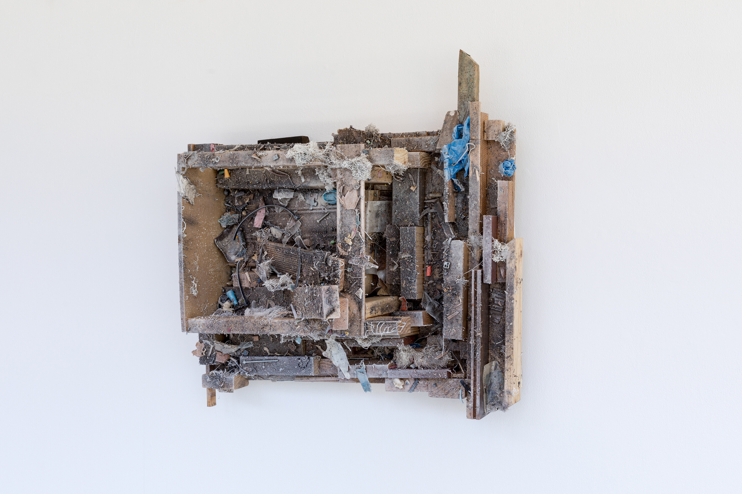 Through his titles Elms cheekily points to the absurdity in the unremarkable. A personal favourite, Like being naked in front of a pet (2025), calls to mind a familiar moment of laughable vulnerability. In Make-up girls making-out 1/2/3 (2025) three wall-sculptures are adorned with dirt and dust, like icing sugar on a cake. Lace-like webs and doily fragments offer the wooden structures a charming delicacy. Gleaned from the outside world with their coating of grime intact, each work carries the trace of its original life.