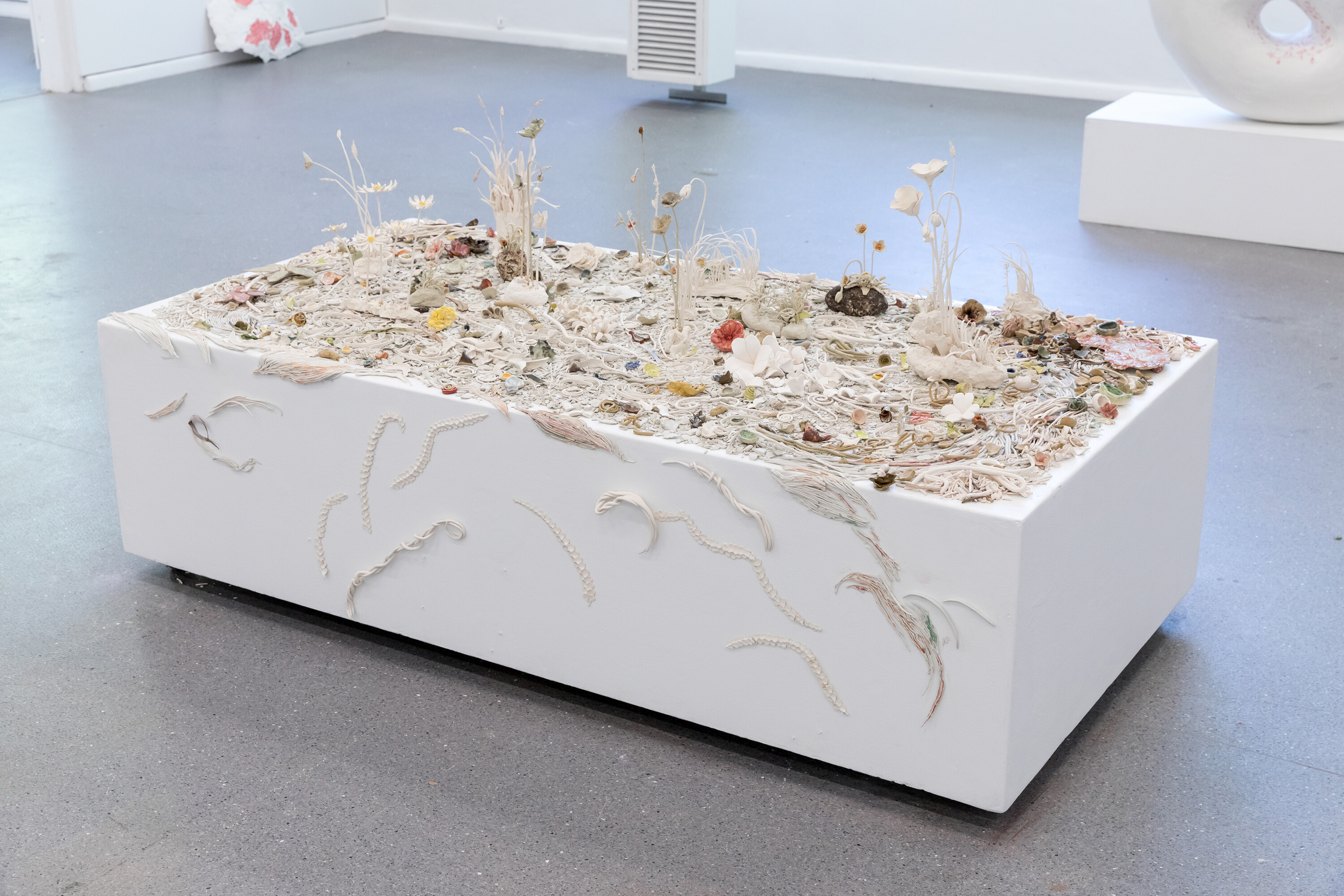 Kirstin Charles, Forest Floor, 2025, Stoneware, earthenware and terracotta clay. Stoneware, earthenware and underglaze glaze. Monash University Caulfield. Photo: Andrew Curtis.