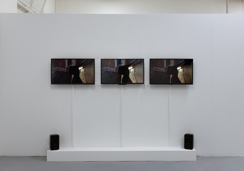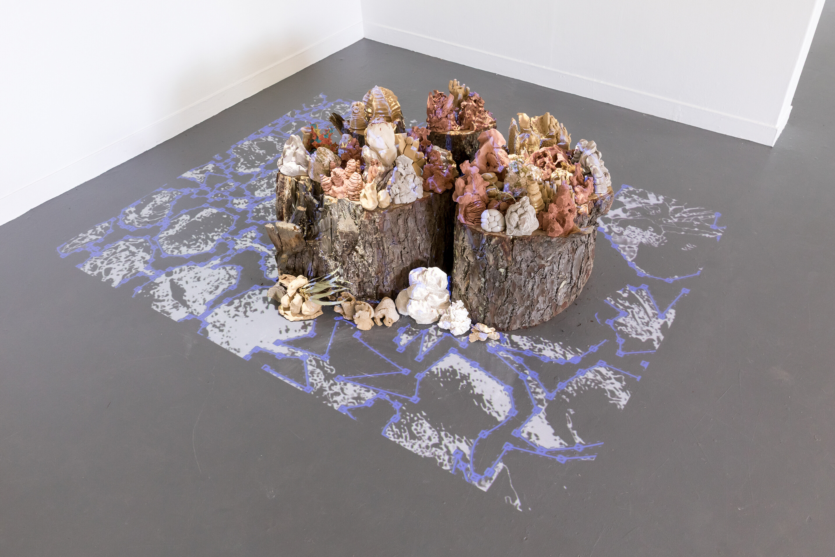 Complementing Forest Floor, Amalia Série-Ruiz’s multimedia work renders a marine oasis. Despite the domesticity of its title, Paillasson (2025) which is French for ‘doormat’, the work would be most at home on the threshold of a coral reef. Overlaying the islet is a projection of geometric patterns that magnify the texture of each form. Their digital veil animates them further. White and blue shapes recall the movement of dappled light through sea water. Unfired, the colony of coral is vulnerable to destruction. Perhaps this is what Série-Ruiz suggests through her choice of title. Time will stamp its feet on this oceanic doormat. There is an urgency in this impending peril.