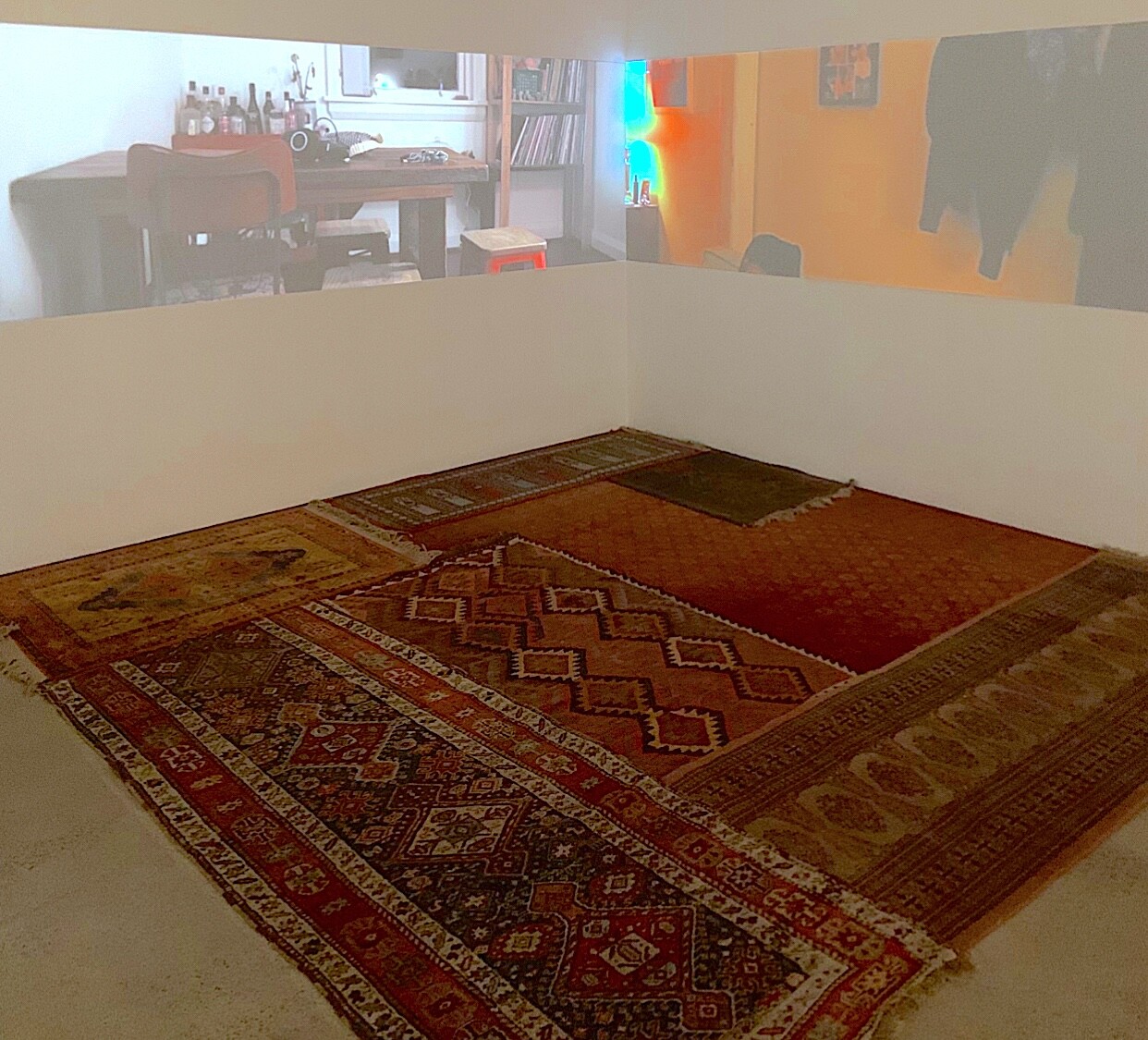 I wander next to the galleries, where Isabella Page’s a communal return carves out a small space to sit and meditate on the mundane. Here, the floor is concealed beneath an assortment of overlapping Persian carpets, the sprawl of geometric patterns dulled in areas from the press of countless visiting feet. Accompanying this, two video channels broadcast a pastiche of domestic routines. I watch someone’s back as they attend to a stove, the countertop cluttered with vegetables and appliances; a shift, and two people plod to tidy up a backyard garden. Minutes are spent brushing teeth in a Betty Boop shirt, a stuffed rabbit stares forlornly atop a desk.
