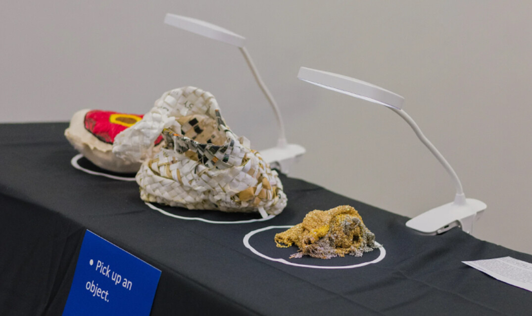 In the ominous space of UNSW’s “Black Box”, Delaram Sarjami has assembled a bittersweet tribute to Iranian and Afghani needlework. Beneath the Silk’s Skin consists of three objects: a cushion embroidered with a flower, a fragment of kilim woven not of wool but rather of metal, and an unorthodox handbag. Though braided in the manner of a traditional straw basket, it is composed of scraps—an amalgamation of daily waste threading together handwritten notes, care labels, pill packets, even chains. As I take up the invitation to hold each object, video projections come to life, showing a group of Iranian women toiling at looms. Obscured to anonymity beneath a watery filter, they practice Naqshe Khani, or pattern singing, whose lyrics serve as directions when crafting the intricate designs on Persian rugs.