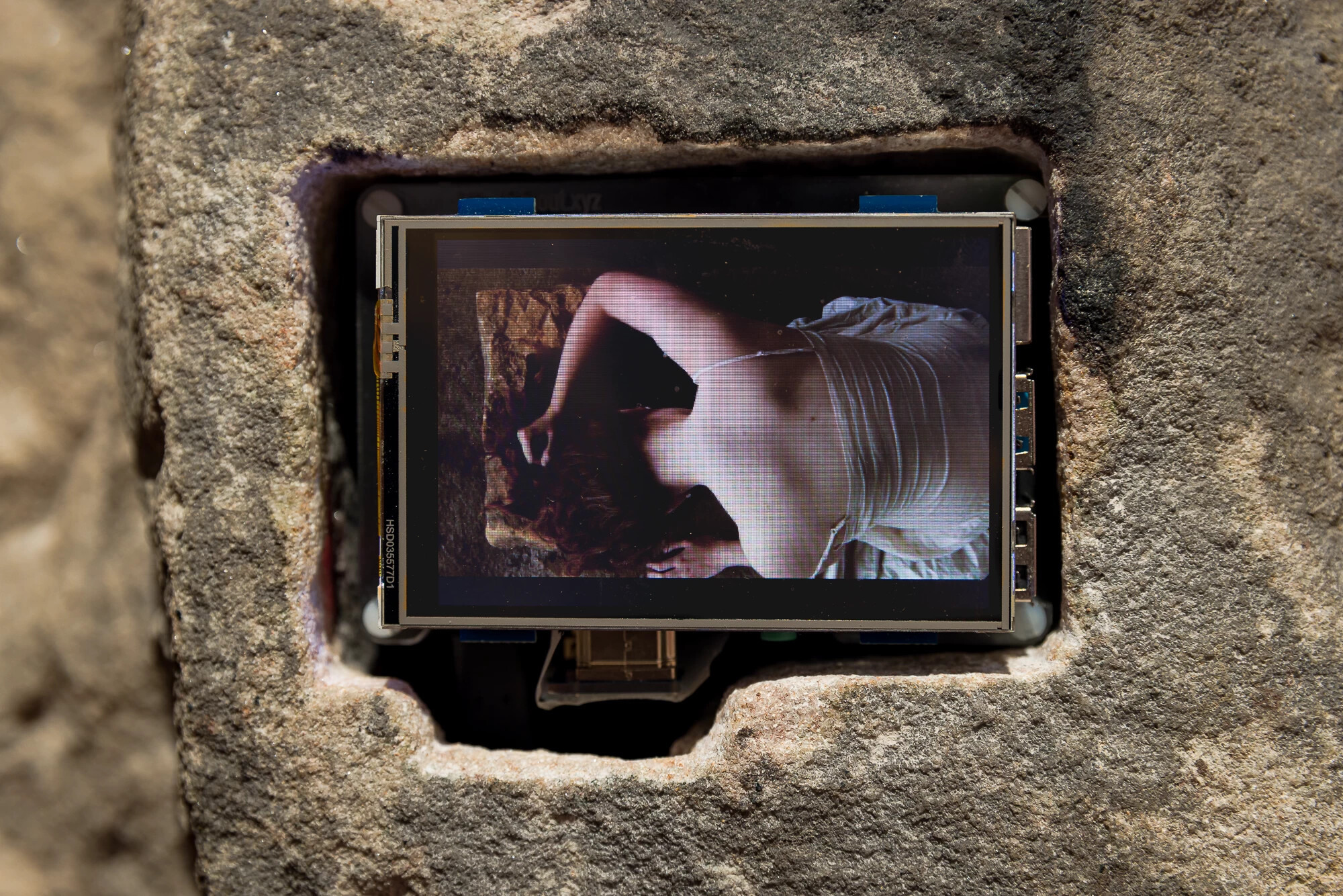 Perched within a carved recess is a small video player documenting an occult performance. We glimpse a bird’s-eye view of the artist leaning over, bunching her hair into the stone and grinding it in an exorcistic, self-flagellating ritual. Kerr reinstates friction into this raw material which is flattened and buffed for Sandstone Futurism (the contemporary aesthetic of settlement, perhaps). In her performance, extraction of the land is entangled with the extraction of the body; the morbid sacrifice that underskirts dispossession.