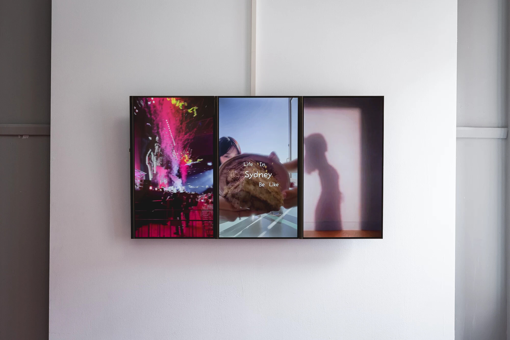 I can’t help but think about Steele and Kerr’s works when I reach Passages (2025) by S.U. on the upper level. The three-channel video installation presents what looks like CapCut-edited montages of Instagram-ready #SydneyLife reels. On the central screen, a sequence of clips: aquamarine waves, someone joyfully skipping into the pastel horizon, a busker at Circular Quay. The text “Life in Sydney Be Like” is overlayed in a cutesy font. Fade to black. A word appears on each of the three screens, “Memory. Moment. Becoming.” I’m waiting for the record to scratch; surely this is ironic. It never comes. S.U. is sincerely romanticising life.