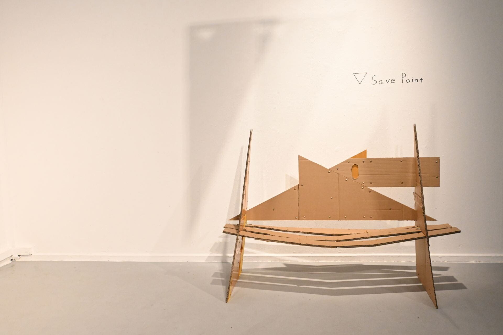 Wandering up to the masters’ studios, Olivia Lin’s work was distinctive in its self-reflexive humour. Her exhibition space was a small corner cube, which felt cluttered and cramped—as tool sheds usually do (albeit this is a mock one). Cardboard sculptures filled the floor, walls, and hung by transparent wire from the ceiling, depicting re-imagined everyday objects such as a bench, hand-saws, and hinged cardboard flags scrawled with workshop notices. A wonky asymmetrical cardboard bench—reminiscent of something out of a Mad Max set design—sat in the corner, studded with metal L-brackets and screws that appeared to be doing less of the actual structural work, but rather gave the impression of holding it all together. Lin refers to her works as “surfaces without utility;” through repurposing discarded packaging, she uses the medium to explore precarity, futility, and absurdism. The faux-functional structures enact the tool shed as a metaphor for art-making as coping, with humour and irony operating as strategies to navigate chaos while revealing the psychological impulses behind the work.