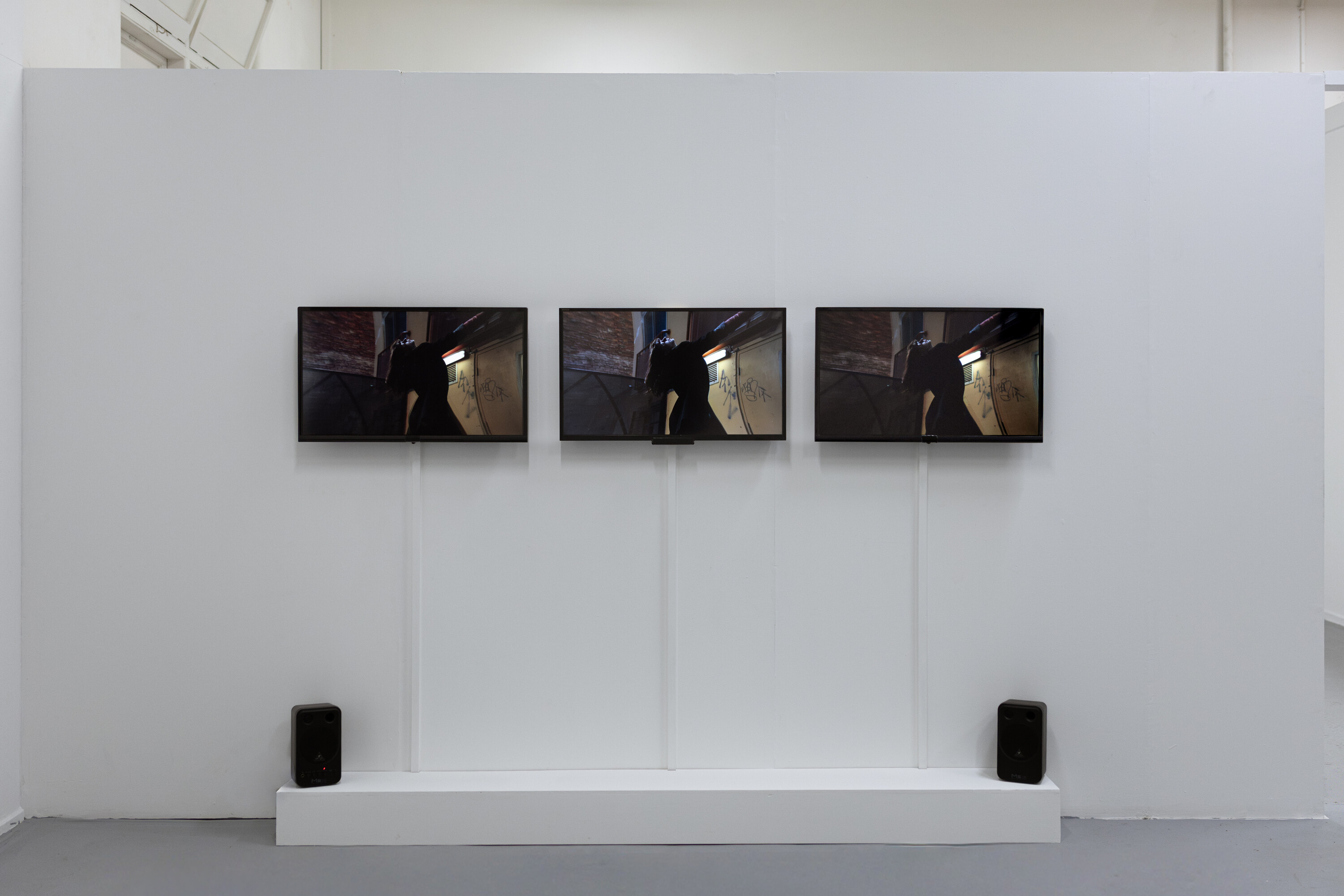 Across the RMIT graduates’ work, subjectivity is explored less as a personal confession and more as a way of finding one’s bearings. Self-positioning and disclosure operate as navigational tools for orienting oneself within the dense landscape of contemporary social and economic pressures. Isabella Rose Cort’s work in the honours cohort exemplified this sense of wayfinding. Isabella—a professionally trained ballerina—explored embodied movement on-screen alongside warped and distorted views of city-life, moving between moments of blurriness and clarity. Their work titled hush heresy heave was presented as a three-channel 14:30 minute video installation mounted on three small screens hung neatly against the wall. Each screen flickered on-and-off, occasionally joining in unison in their own fragmented choreography.