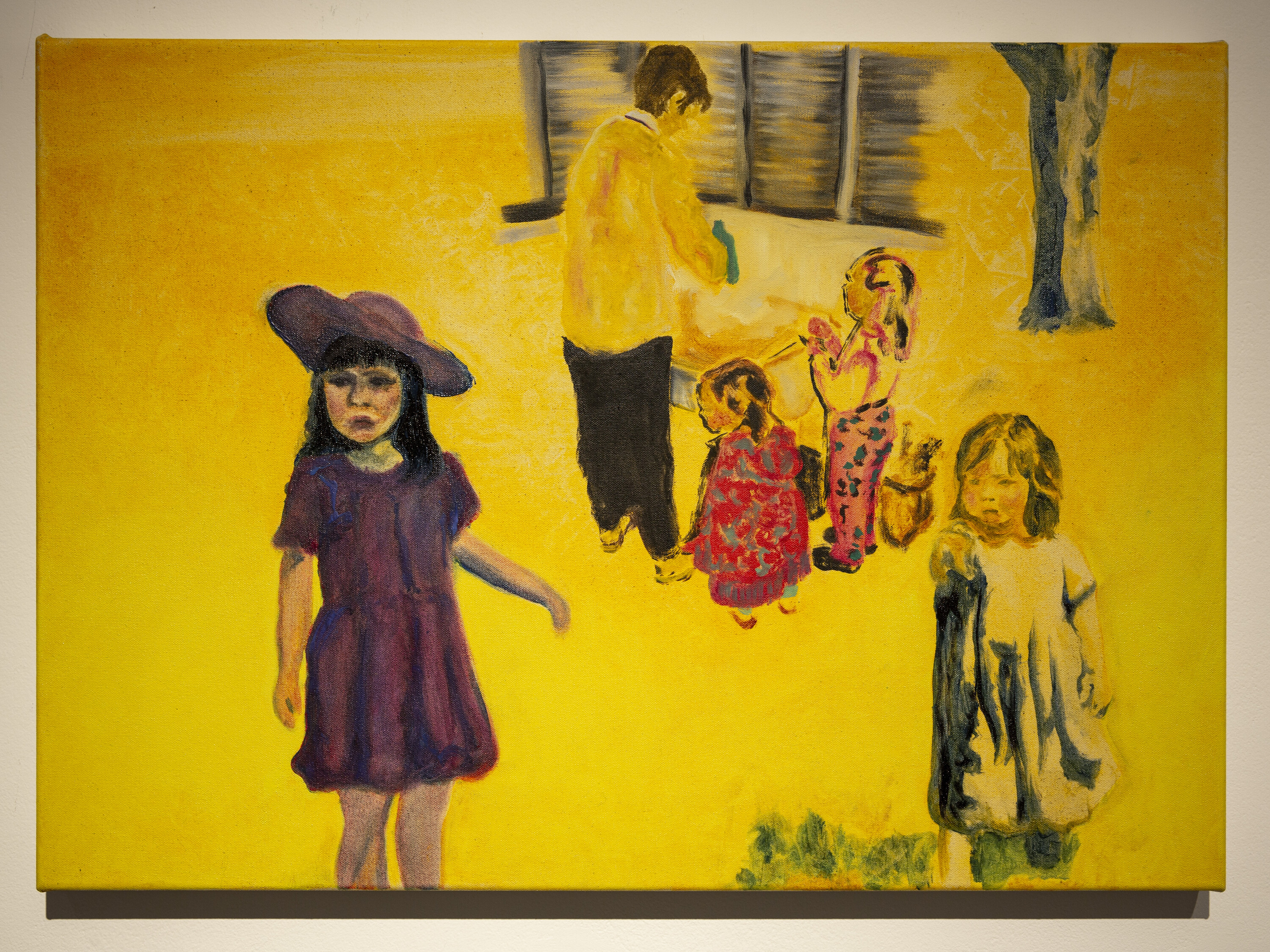 Moving along the honours exhibition, Idgie Kagan presented a series of ten oil paintings on canvas. What drew me to Idgie’s work was an immediate sense of innocence and naivety expressed through the subject matter. These paintings were nostalgic re-imaginings of childhood, depicting kids blowing balloons, playing piano, dress-ups, and flashing nude bums. The colour saturation was high, and contrasting, giving rise to a feeling of reverie or hazy memory.