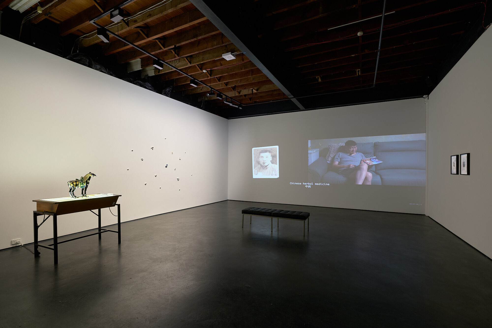 Continuing this sentiment of reckoning with one’s own cultural diaspora, Rachel Hongxun Zhou’s video work, Roots and Ruins, projects the artist’s family history on an expansive wall of the Fiona and Sidney Myer Gallery. The work includes interviews with family, photographs, identity and employment documents, as well as narration from Zhou (statements include “history is never complete”). The unrecorded and unknowable histories outside Zhou’s family archive contribute to an examination of her own cultural identity within a multicultural society, far removed from Zhou’s country of origin. Through examination of her own ancestry, Zhou creates an important dialogue between the viewer and artist, one that promotes mutual understanding and an acknowledgment of the complexities of documenting history(s).