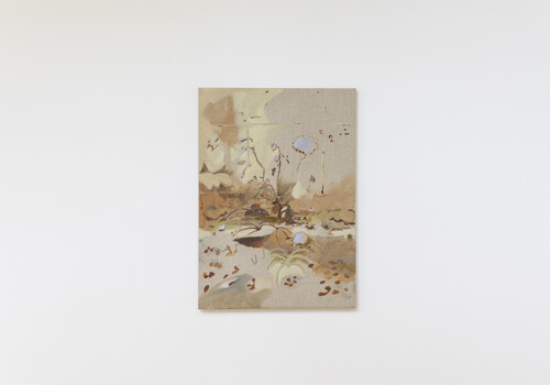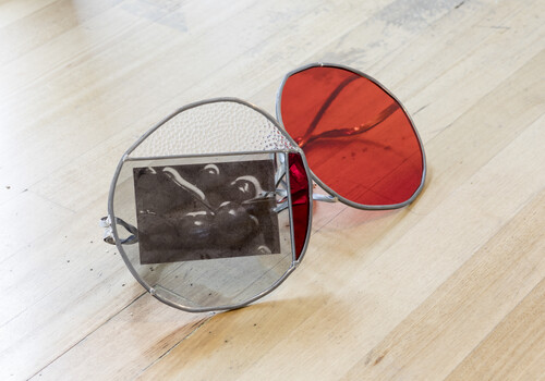 Amelie Thompson’s Class of 2025 (2025) presents beeswax-and-wire sculptures that evoke the spindly legs of birds. Like Eva Hesse, Thompson’s use of beeswax communicates vulnerability and impermanence. The translucent yellow wax, seemingly hand-moulded over wire, creates delicate textures and layers, sometimes distorted, drooping, and bodily. These legs run in all directions, caught in a mass movement, calling to mind a waxen claymation cast. Reading the title, one might imagine the class of 2025 as a flock. Graduation suggests not only future possibilities and existential questions, but also the frantic, often chaotic work of completing assessments. Not to put words in these graduates’ mouths, but if their heads were metaphorically cut off during their final week, they might have kept running and working. Thompson’s wax legs zoomorphises this dynamic, presenting a caricature of a group driven by collective momentum, burnout, and disorientation.