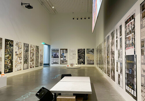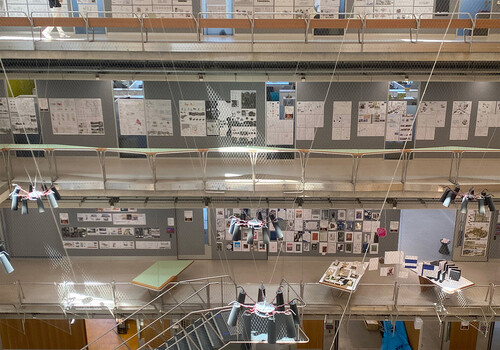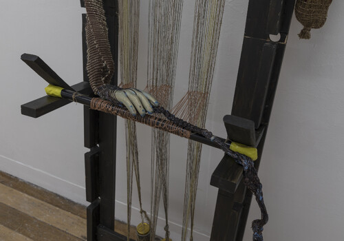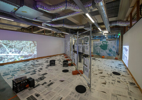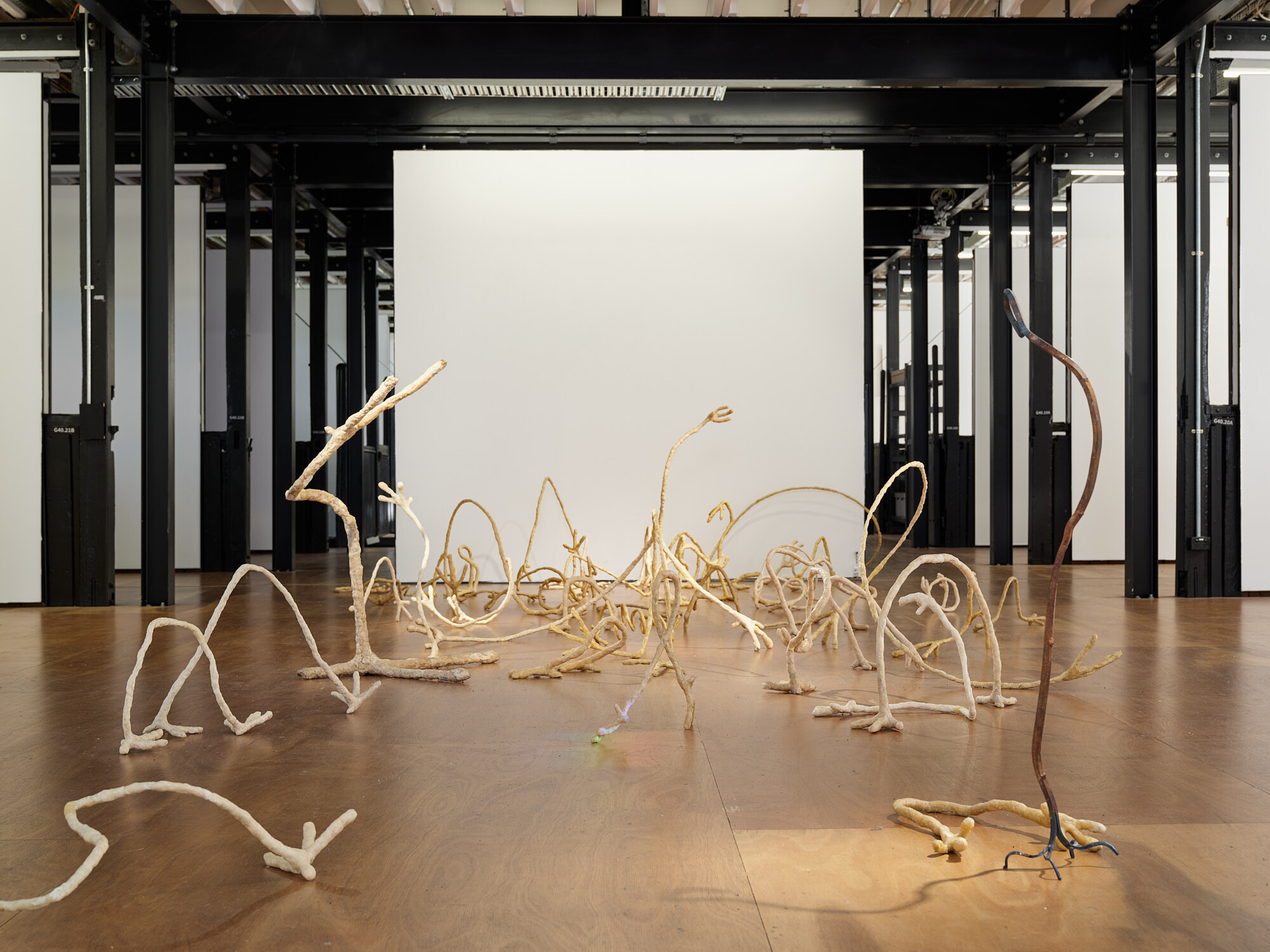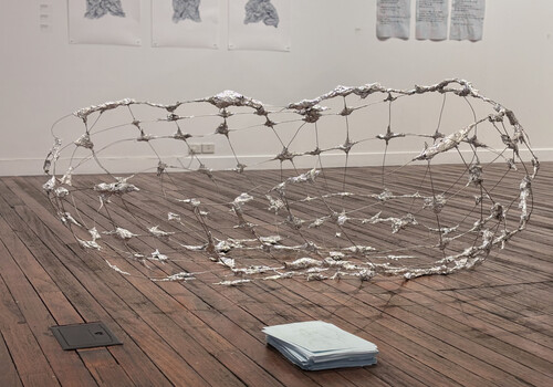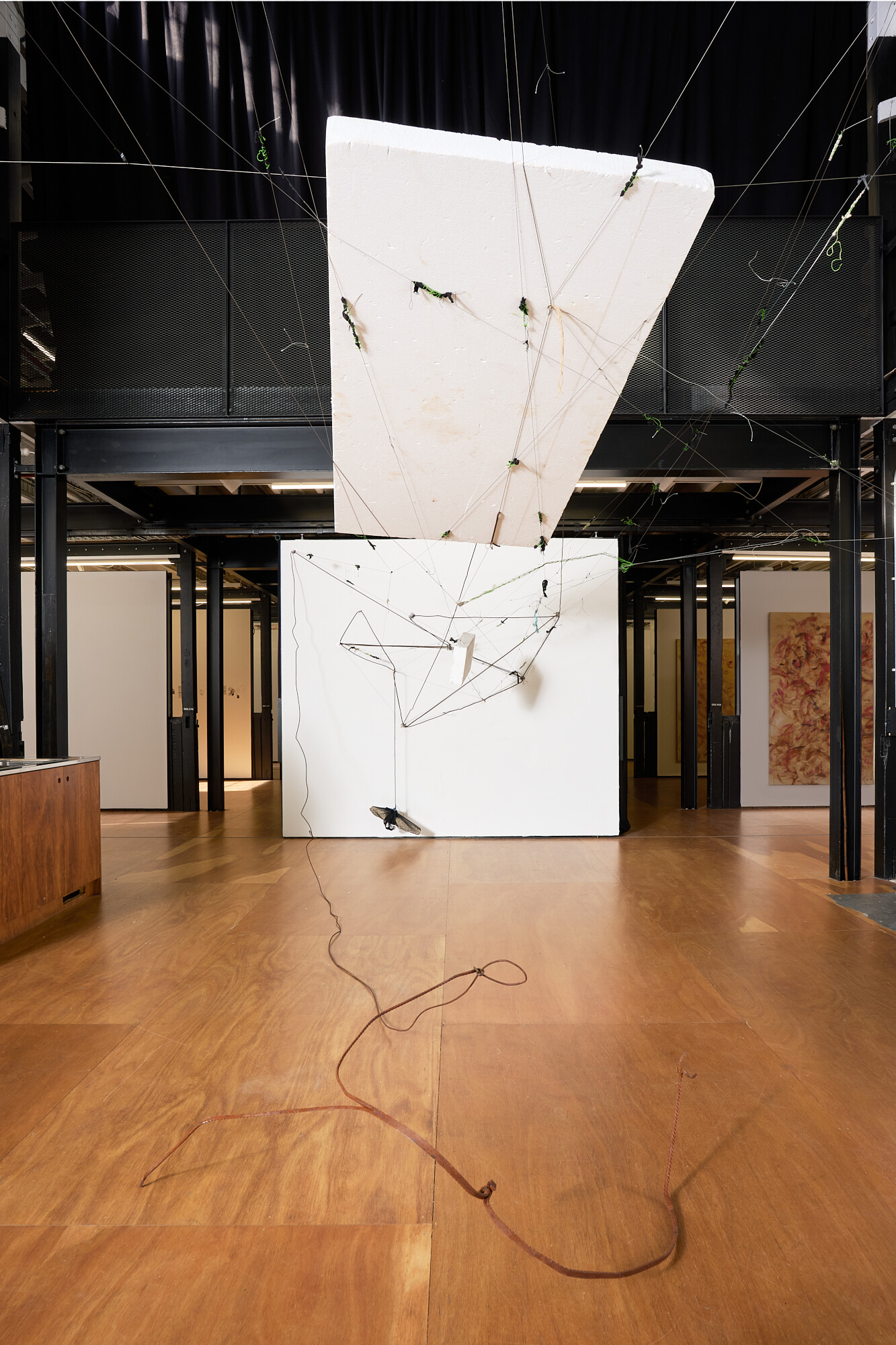 Installation view of Alex Pug Williams, Web of Detritus, 2025, Expanded polystyrene, rebar, 30 metre spring guide, wood concrete, concrete putty, asphalt, plastic, housepaint, bicycle spokes, bicycle handle bar, bicycle fork,[…], VCA, Melbourne. Image courtesy of the University of Melbourne. Photography by Astrid Mulder.