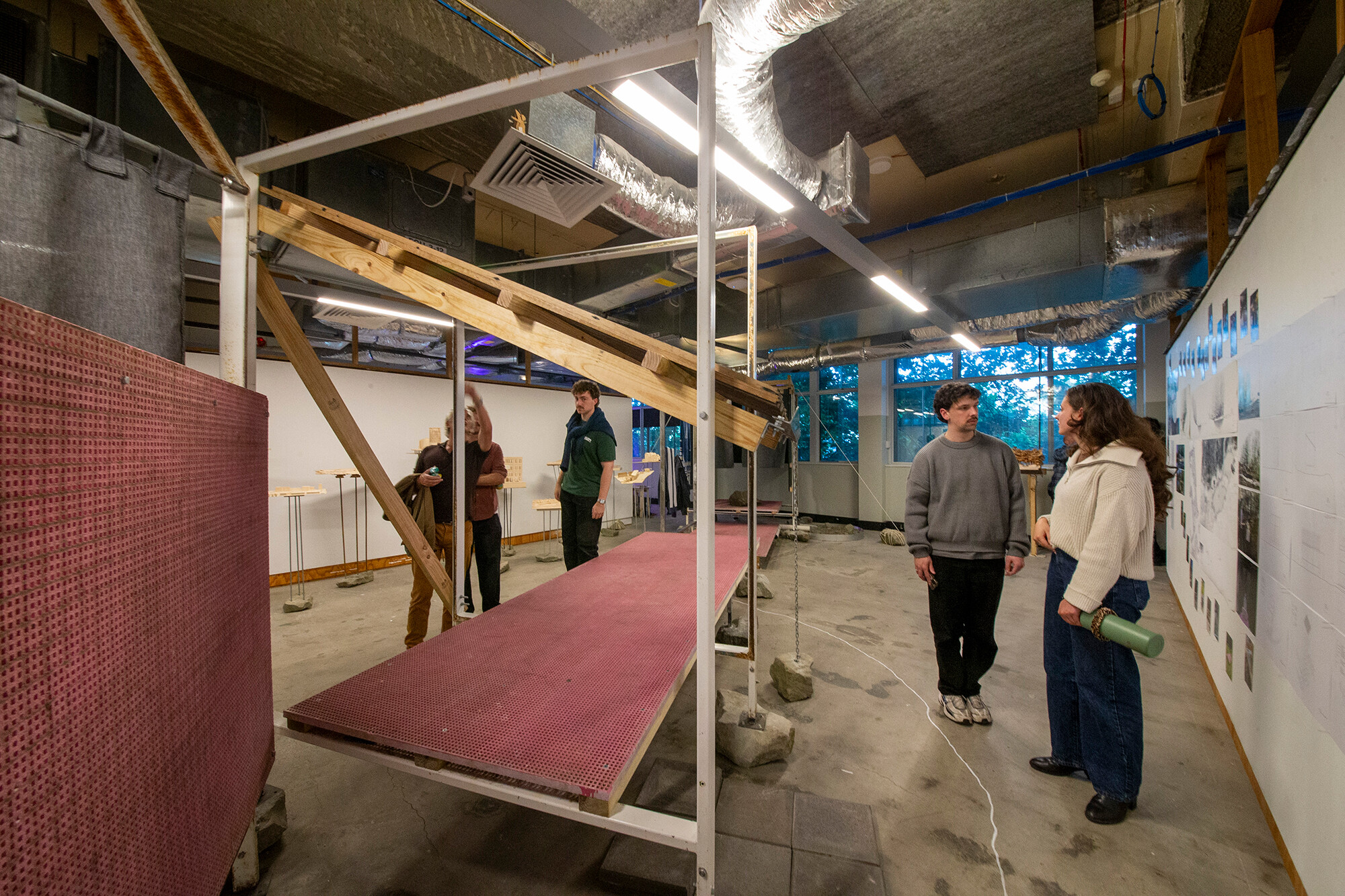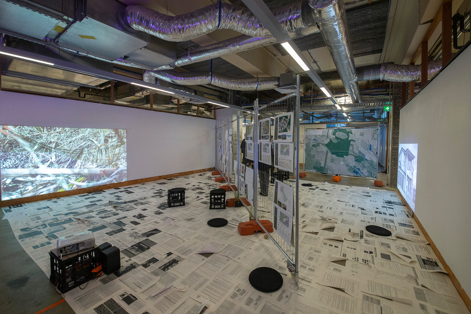 Facsimiles, scans, newspaper clippings, and environmental policy documents are strewn across the concrete floor of Level 3: a bureaucratic archive of decades of attempted environmental protection laid out like evidence at a crime scene. This is the installation of the Masters-level Design Studio, Land (In)equalities, led by Anna Gilby and Catherine Murphy. Architectural drawings are fixed to temporary fencing like that on a development site. A3 sheets map out suggestions as to how we might act with a little more ecological responsibility and care. These attend to place, ecologies, and surrounding environs with more intention than any of the structural or aesthetic ingredients that might typically make up a student design project.