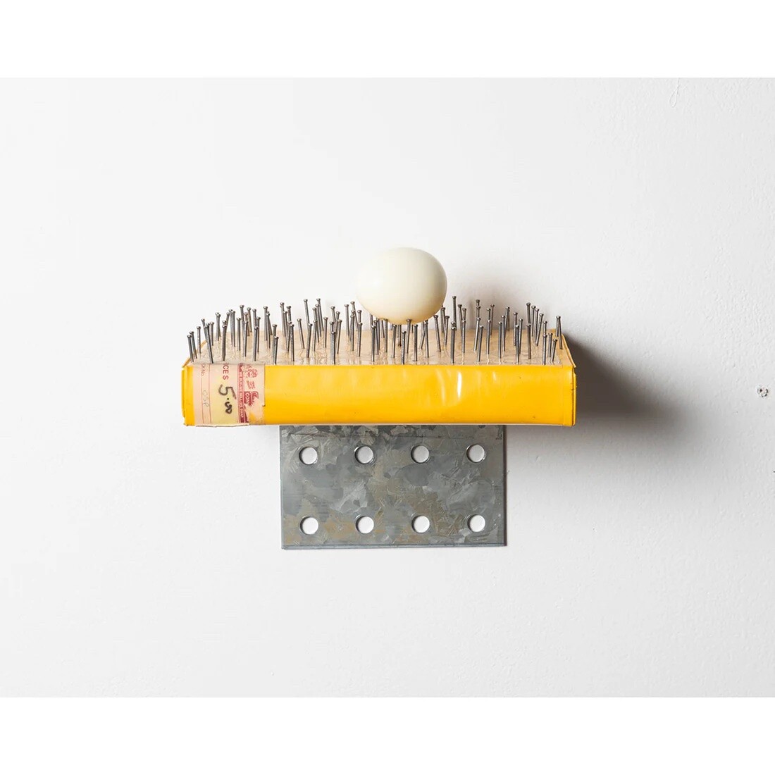 Mia McCall, Futile Devotion, boiled egg, 69 nails, VHS tape, metal, 20 x 22 x 14 cm, National Art School, Sydney, https://gradshow25.nas.edu.au/collections/mia-mccall/products/futile-devotion. Photo: Courtesy of the National Art School.