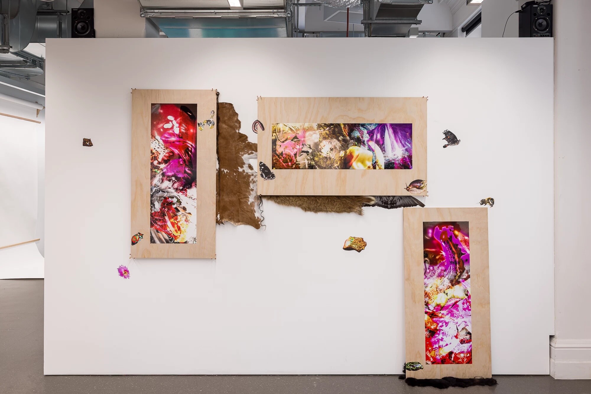During the media preview, I catch up with the tour group as Lara-Marie Wilkinson is providing an artist talk for Porous Sufferance (2025). The fuchsia triptych of digital photo collages on plywood is a cacophony of wings and bugs manipulated together with images of the artist’s body. Reworking Julia Kristeva’s concept of abjection, Wilkinson talks of “infecting” the space with her chronic pain. Across the plywood and white gallery wall, vinyl stickers of ants eating apples, slug-like creatures, and bees, puncture the rectangular architecture. Rabbit, goat, and deer hide partially frame and cushion the glistening biomorphic photography. As the crowd dissipates, I am drawn to the rhythmic beating and cracking that echoes through the gallery space. Working alongside her disenfranchised ancestors, Wilkinson references Mauritian Sega—music and dance used as a mode of resistance against dehumanization—which is characterised by the drumming of the goatskin-clad ravanne instrument. The artwork’s positioning amongst the sullen cabinets of taxidermy birds lining the hallways of the Old Teacher’s College reminded me of the bird netting in the courtyard. I think of how certain bodies are abjected and excluded by the very structure of colonial institutions.