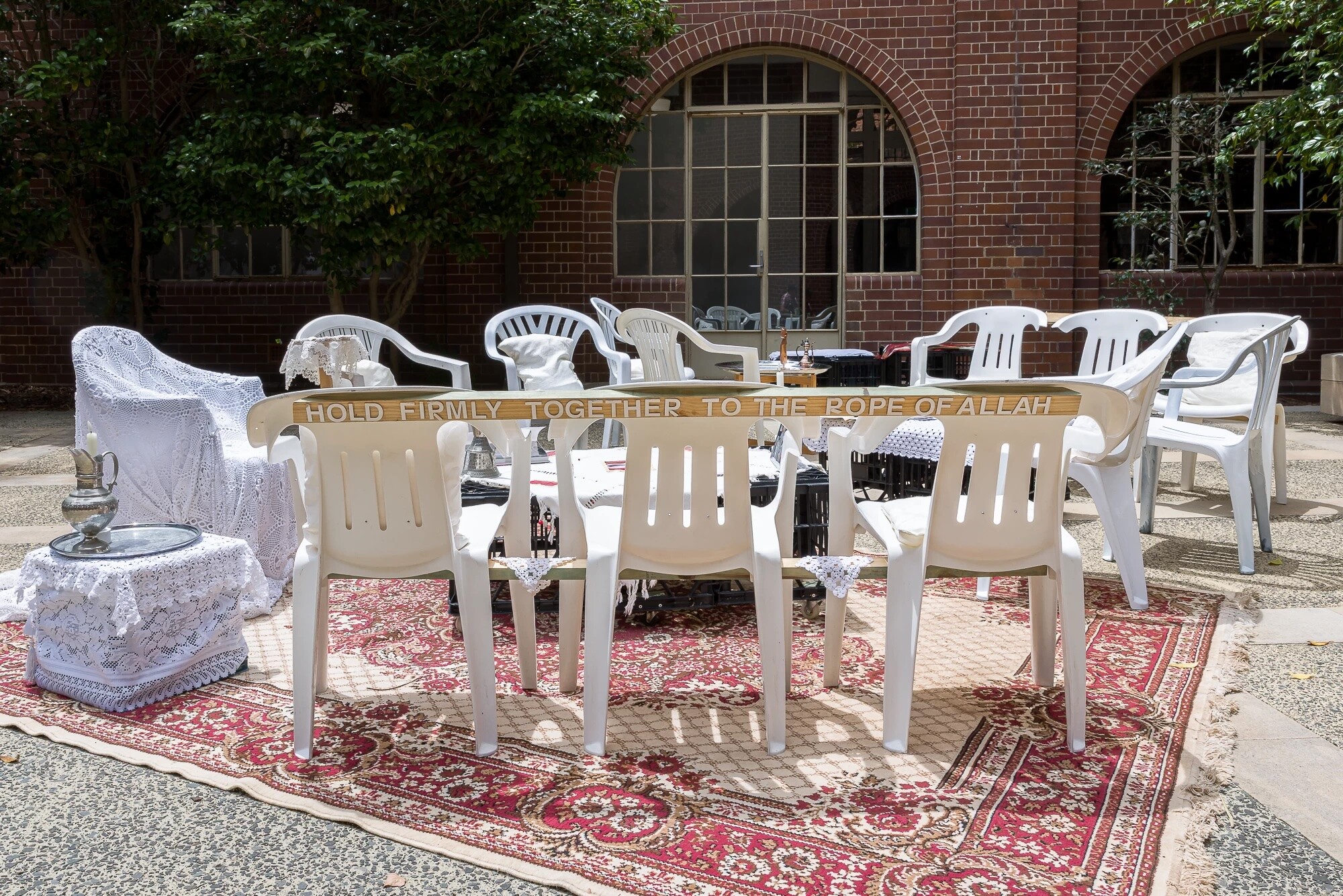 I stand beneath the netting, amongst Ayşenur Kara’s installation, And hold firmly together to the rope of Allah (our third space) (2025). At first, I assumed Kara’s installation was the permanent student lounge— white plastic chairs with makeshift side tables, blue gazebos dressed with Turkish rugs and milk crate shelves and tables. I often hear people lament about the lack of “third spaces” in Sydney, the quest for a space that is neither home nor work. Kara reminds us, these social spaces are not discovered, but made and furnished by community. The modification of cheap furniture and found materials is a reminder of the Pro-Palestinian encampment on the Quad Lawn in 2024, when students demanded the University of Sydney cut ties with the terror state of Israel. USYD eventually cracked down on the protests, calling these makeshift structures “obstructions to campus.”