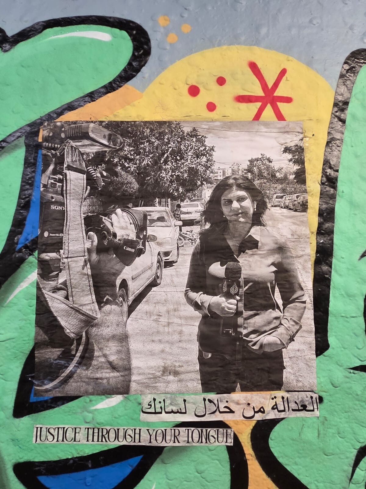 As I leave through the USYD Graffiti Tunnel, I am drawn to Kara’s Hands, Heart and Tongue (2025) amongst the colourful noise. Beneath an A2 screenprint of martyred Palestinian journalist Shireen Abu Akleh are the words “JUSTICE THROUGH YOUR TONGUE” (in Arabic and English).