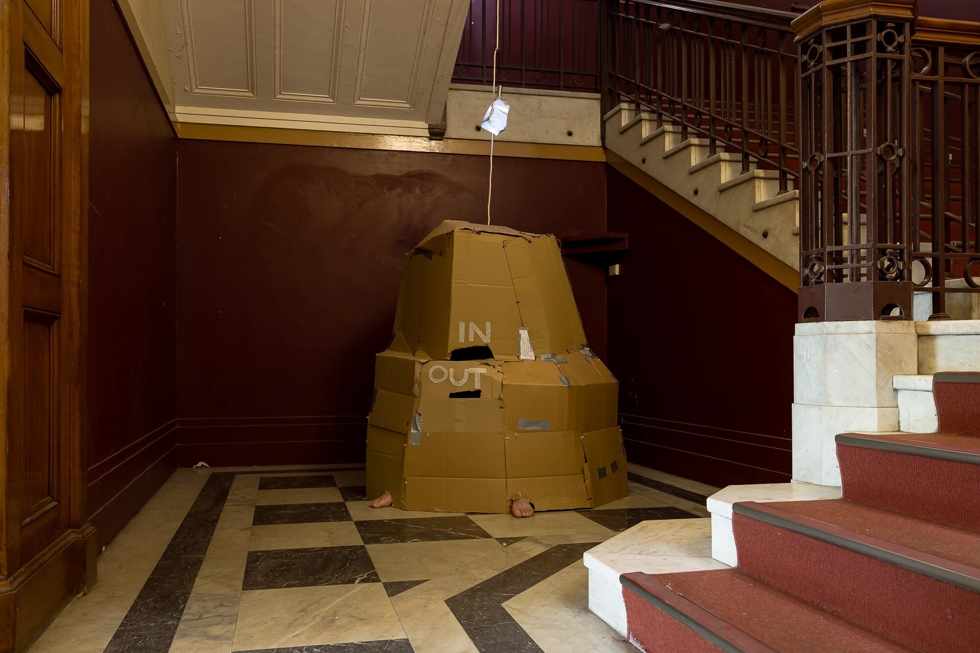 Tom Band’s cardboard dome, the complete life & times of (2025), could be considered a one-person tent, if that one person was sitting upright on a small stool. The artist’s bare feet poke out from the bottom of this claustro-cosy sculpture. Signage invites me to pop a gift through the slot titled “in” (I gift a Chinese Acupressure Ring) and in exchange, I receive a glossy, glitchy A5 song-lyric-zine accompanied by a CD. As an Autistic person, I appreciate Band’s scripted interaction. At home, I hook up my portable CD player to my laptop. I listen to the thirty-minute album five times through. The songs, performed by Band and SCA peers, Conner Chen and Lily Tsuruko Tucke, drift between aggressively noisy and softly angelic. I catch on to the lyric “tertiary vegetation”—a reference to the courtyard perhaps?